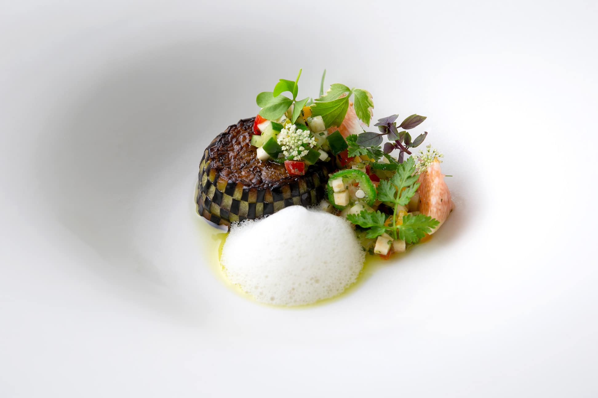 LUBINA BRASA con escabeche de ROSAS, LIMÓN quemado y VERDINAS