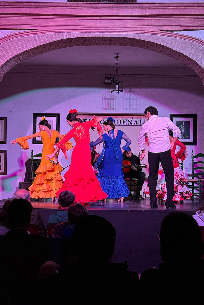 En el Tablao «El Cardenal» se presenta un espectáculo flamenco auténtico, cargado de pasión y colorido, protagonizado por un elenco de siete artistas de gran talento. El espectáculo ofrece un recorrido por los diferentes palos del flamenco más puro, como fandangos, soleá, bulerías y alegrías, entre otros. Las actuaciones tienen lugar en un patio con capacidad para 100 personas, creando un ambiente íntimo y acogedor.